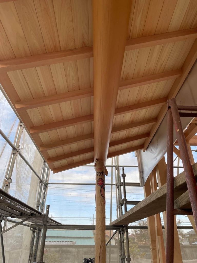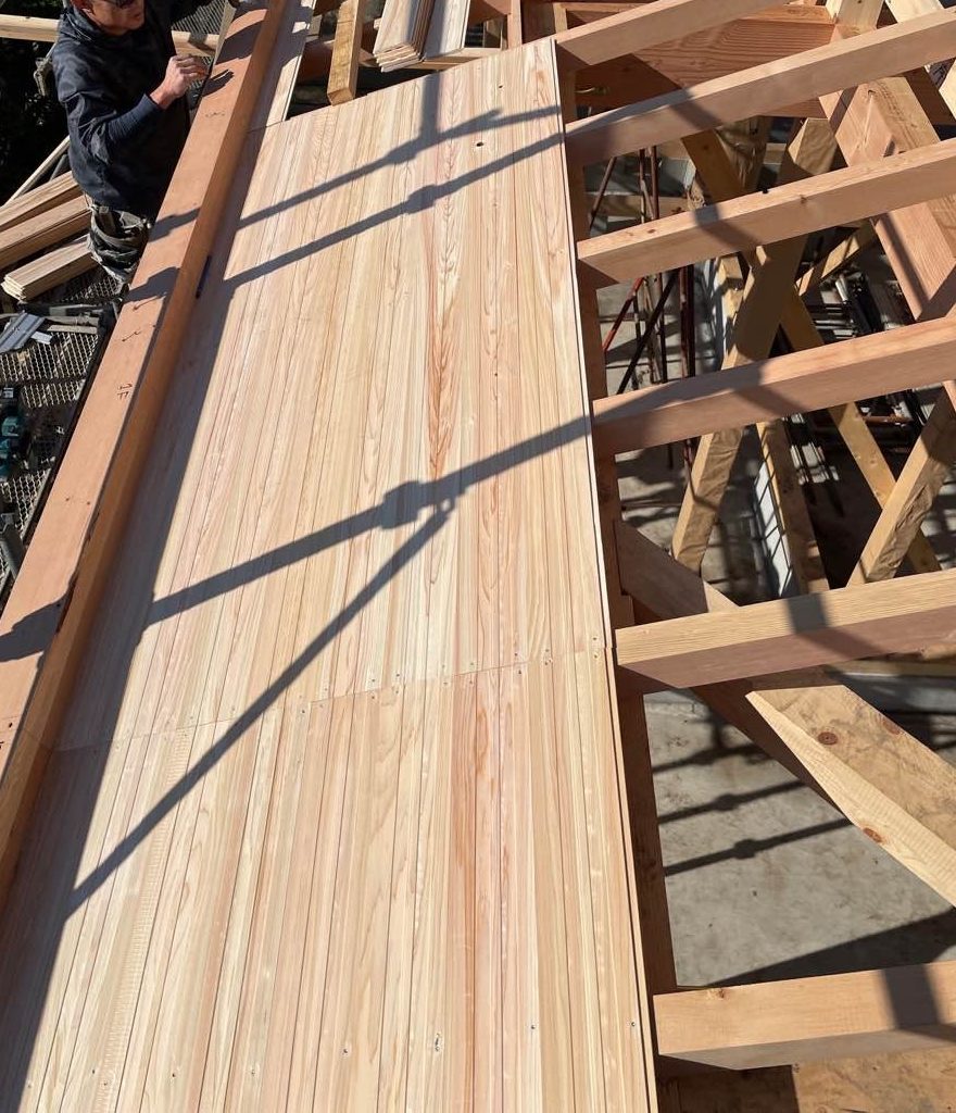 化粧垂木(けしょうたるき)と化粧野地(けしょうのじ)の施工の様子です。